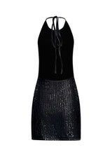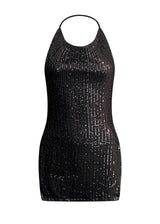 Turn heads all night long in our 'Out All Night' dress. Made with our shimmering stretch fabric that hugs your curves in all the right places, this dress features a sultry open-back halter design. Pair it with clear heels for the ultimate night-out look.